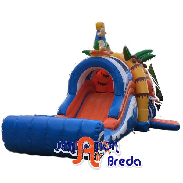 Met een hele brede glijbaan en diverse speelobjecten is dit speelkussen super beach helemaal compleet. Heb je een feestje met als thema strand of zee dan is dit kussen niet meer dan passend. Je waant je praktisch al op het strand en hoort de zee bijna ruisen. Dit springkussen is ook te huur met een bad aan het eind van de glijbaan, wat het een nog hoger strandgehalte geeft.